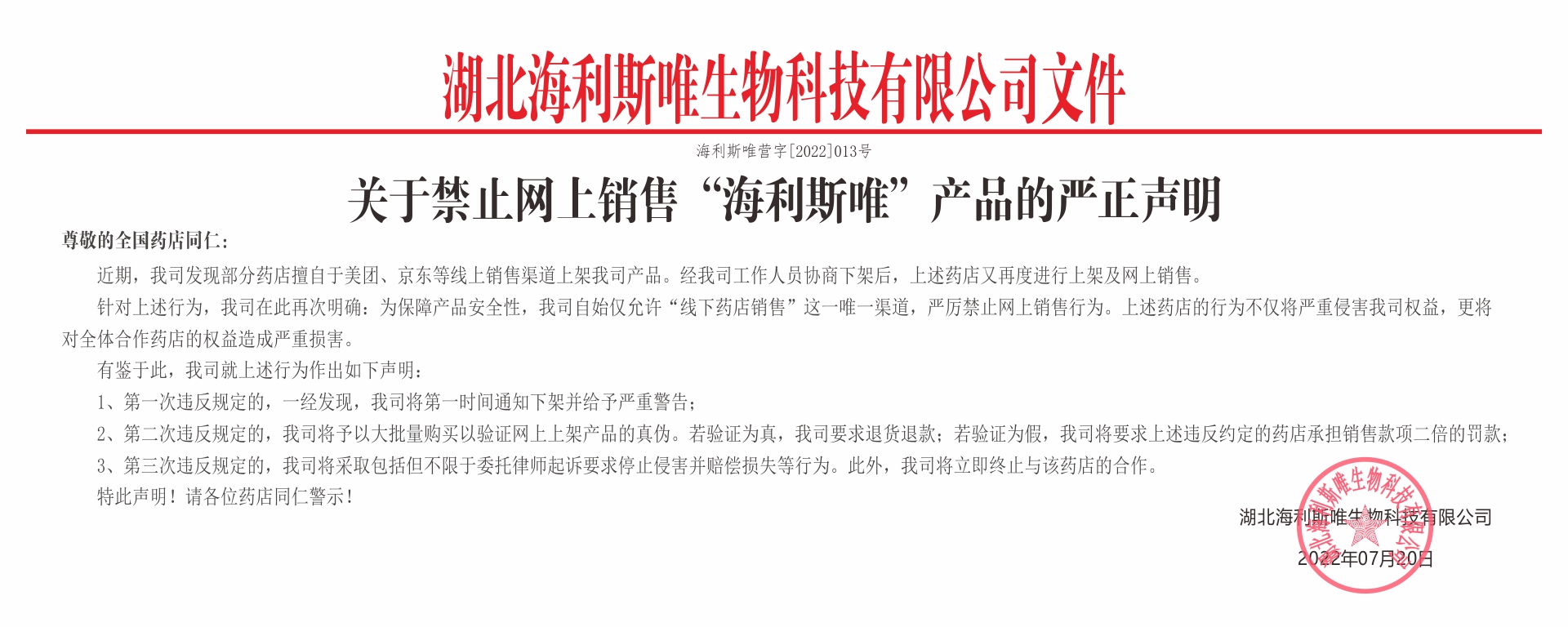 關于禁止網(wǎng)上銷售"海利斯唯"產品的嚴正聲明